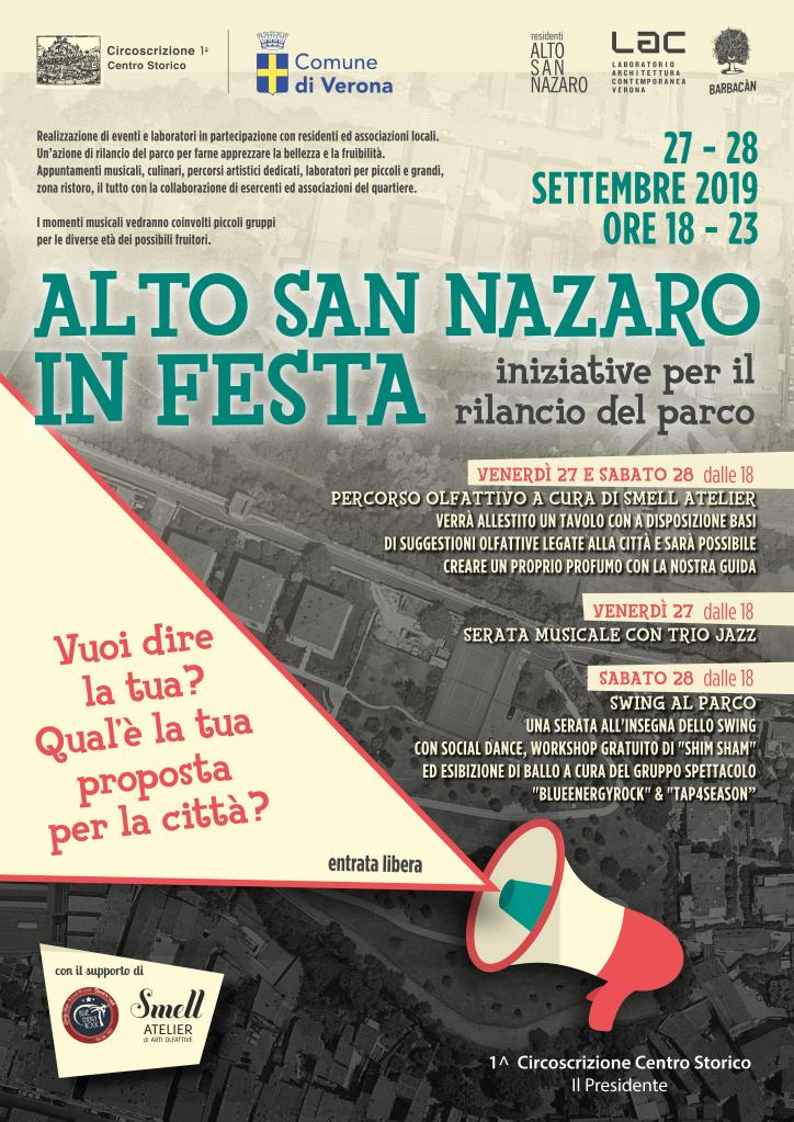 Evento creato per rilanciare il Parco di Alto San Nazaro, per far scoprire la sua bellezza e fruibilità, a partire dagli abitanti del quartiere, ma anche a tutti i residenti ed ai visitatori della città di Verona. Abbiamo proposto eventi musicali e culinari al tramonto, balli e laboratori per due serate di festa.