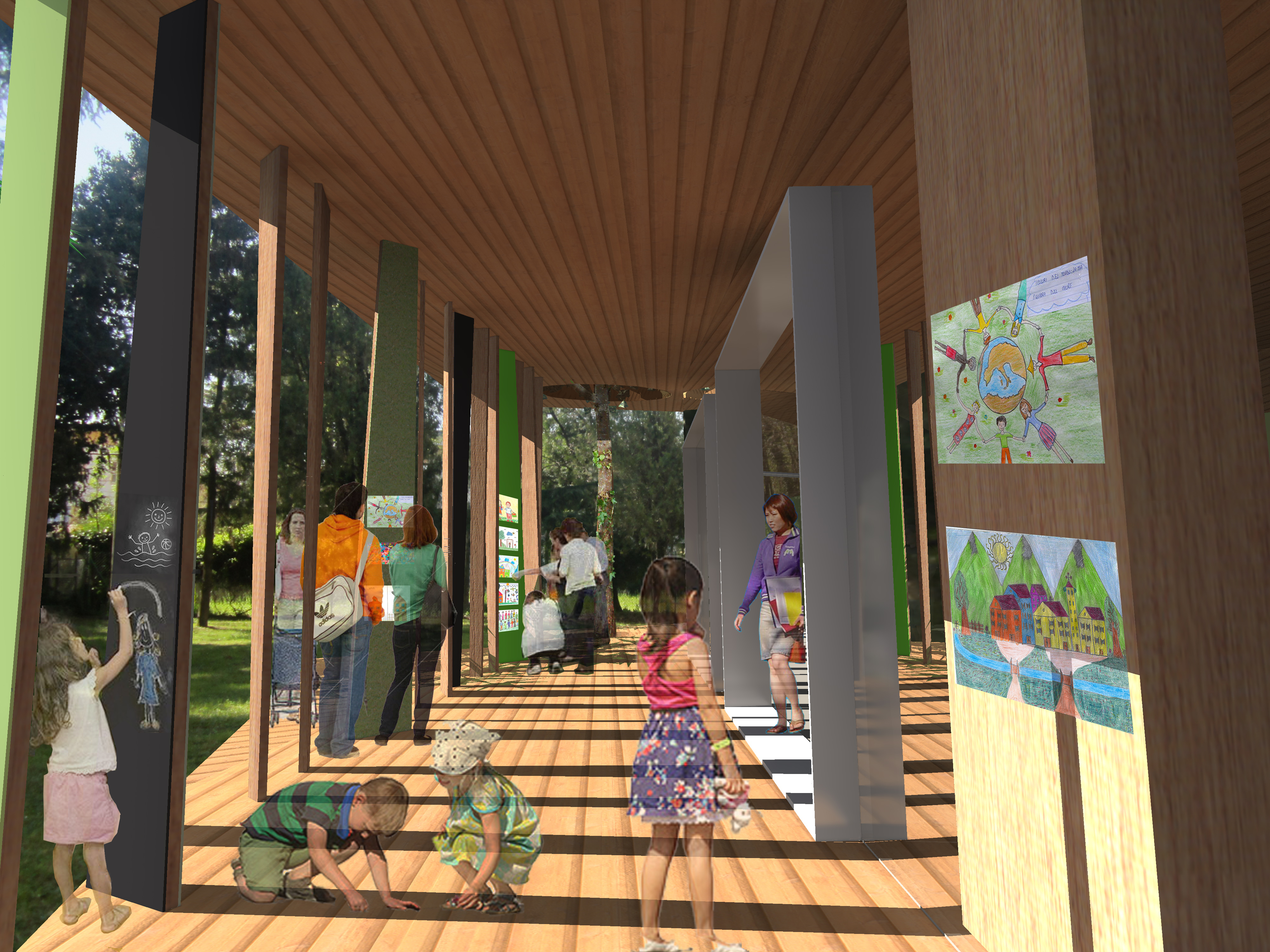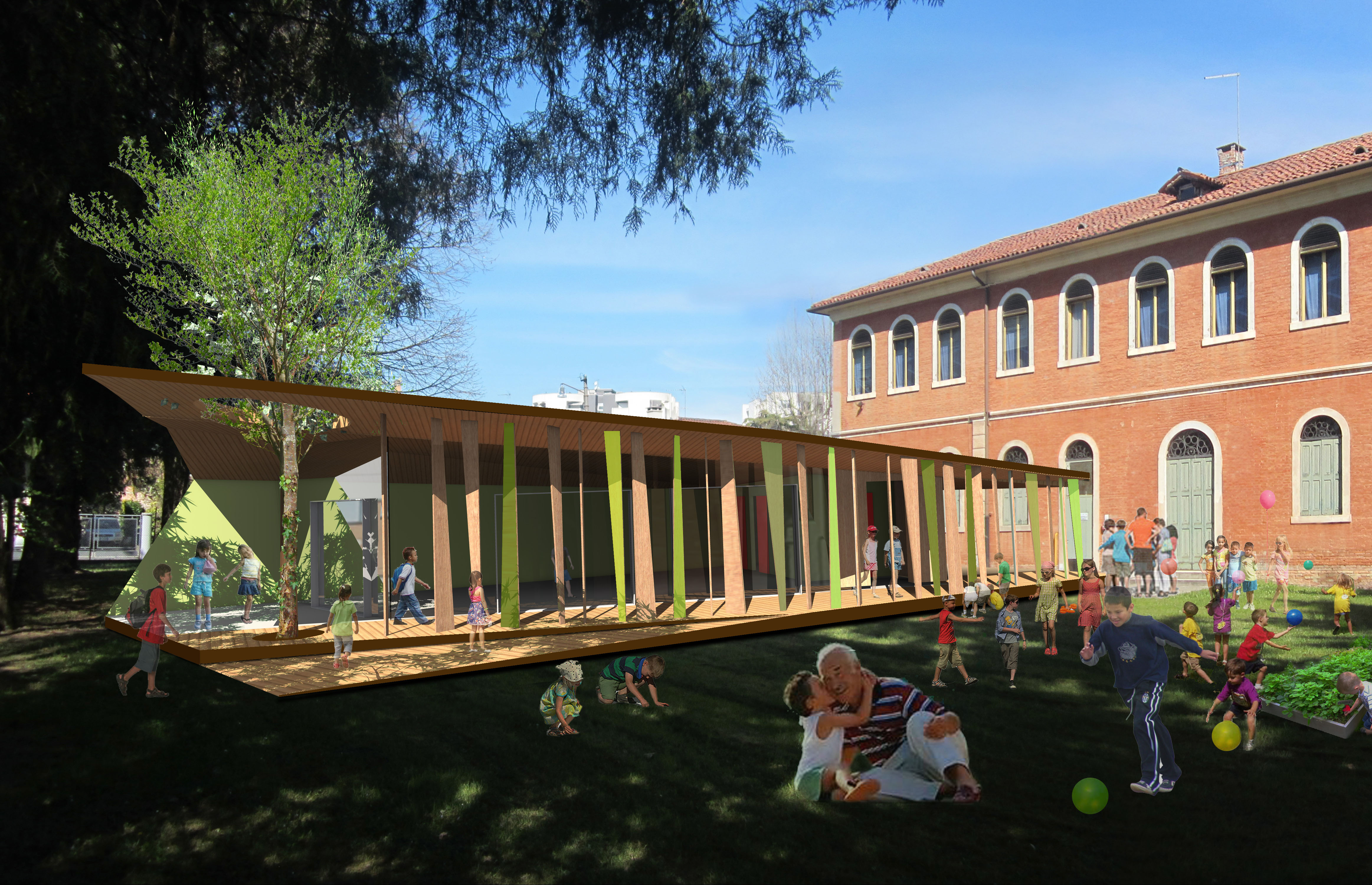 Si prevede la costruzione di un padiglione prefabbricato in legno a minimo impatto ambientale. Le scelte alla base del concetto architettonico muovono tra la definizione dell’orientamento ottimale (compatibilmente con il lotto ed il sedime dell’edificio esistenti), e l’attenzione alla qualità abitativa degli spazi di socializzazione interni ed esterni, sia nei termini di progettazione che di comfort generale. Fondamentale il contenimento del fabbisogno energetico dei costi di gestione in tutto l’arco dell’anno grazie all’utilizzo di strategie attive tra le quali un impianto a fonti rinnovabili per il riscaldamento e raffrescamento; e passive come ad esempio l’isolamento dell’involucro come pure la progettazione dei portici di protezione delle superfici vetrate esposte.