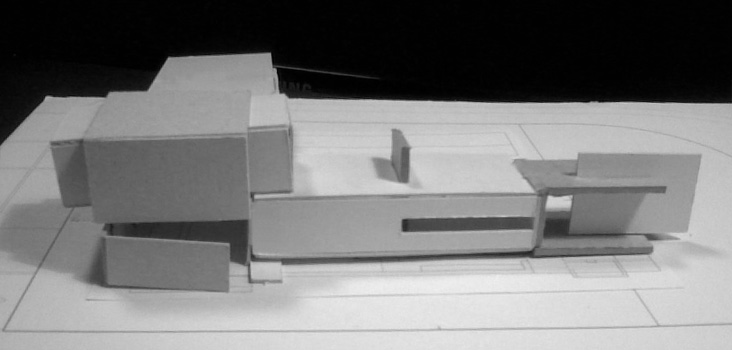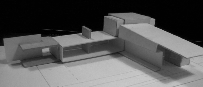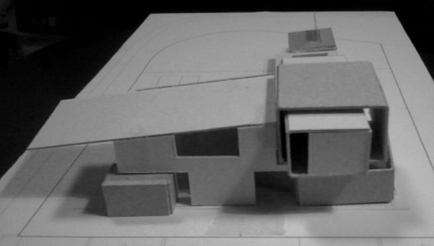 L’impianto plani-volumetrico si compone di tre volumi distinti. I primi due al piano terra determinano l’assetto in pianta allineandosi con le strade di lottizzazione ad est e nord, mentre il terzo, al piano primo, articola la struttura complessiva quasi con l’intenzione di scomporla. E infatti il prospetto est, caratterizzato da una grande falda, viene profondamente modificato, da una parte proprio dal volume aggettante al piano primo, che sembra muoversi dentro un “guscio”, dentro una sorta di doppia pelle, e dall’altra da un sistema di pieni e vuoti prodotti dallo stesso programma abitativo che prevede qui gli spazi della conversazione e del relax. E’ come se l’articolazione interna degli spazi trovasse una sua identità e configurazione anche all’esterno. Il volume posto a nord, che si sviluppa sulla direttrice est-ovest, si pone come una figura semplice e lineare chiusa verso il lotto confinante ed aperta verso il giardino privato; un sistema di grandi vetrate e di elementi frangisole caratterizzano lo spazio a portico che diventa filtro tra l’interno e l’esterno. In questo volume viene organizzata la zona riservata alla cucina e al pranzo. Al piano primo la zona notte, aperta verso il giardino interno ed orientata ad ovest, è organizzata in modo tale da lasciare una parte di volume a doppia altezza alla zona giorno di rappresentanza sulla quale si affaccia creando così una interessante relazione percettiva tra i due piani. Lo spazio esterno viene articolato a partire dai rimandi visivi che collegano idealmente gli spazi aperti dei portici, ad ovest (in corrispondenza della cucina) a sud (in corrispondenza del soggiorno), dello spazio-filtro che caratterizza il volume lineare posto a nord e dalla piscina che si pone come “traccia d’acqua” con i suoi 20 mt. di lunghezza.